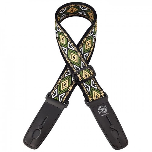 Lock-It Straps woven jacquard Retro series. All straps are 2″ wide soft hand jacquard material with a smooth high quality nylon backing and adorned with the patented and brilliant Lock-It strap locking system. No Guitar mods and a minimalist design sewn into a top class leather end. Straps extend to an extra long 62″ in max length.