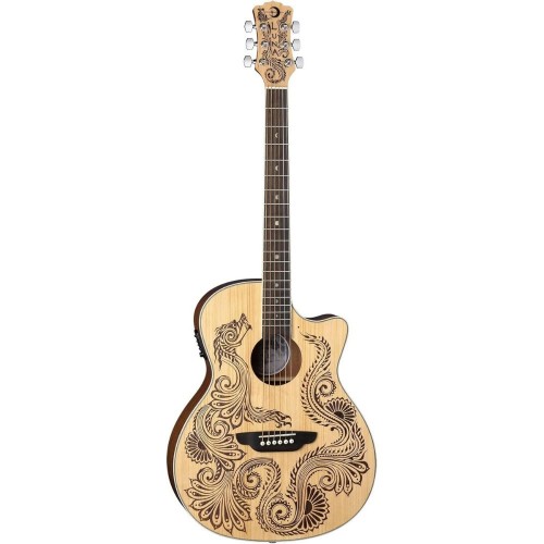 To the early Hawaiians the mo’o (lizards) were a symbol of spirituality and good fortune. Shape-shifting and agile, lizards are one of the oldest and most powerful of Polynesian guardian spirits. These graceful lizards intertwine amongst tropical Monstera leaves on this fanciful uke and are sure to bring good mojo to your playing. This is a Mahogany, set neck instrument,which aids in having a full tone and ability to retain in tune – even after a lengthy set. Built in preamp/tuner offers flexibility to choose between acoustic and amplified play. Plays beautifully, looks beautiful… all at a great value.