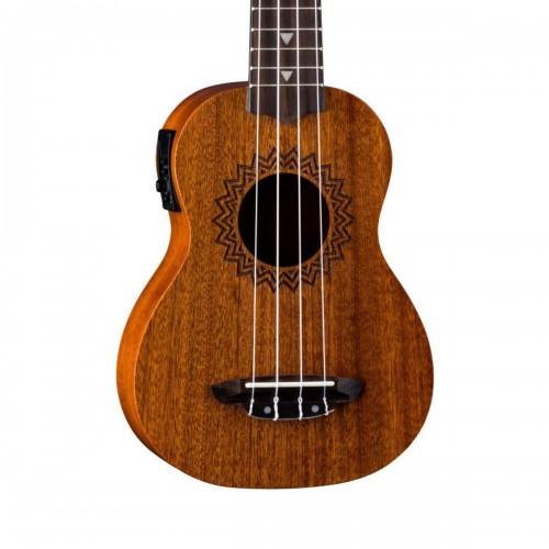The Luna Safari Tattoo 3/4 Size Travel Guitar takes its design from traditional Hawaiian body ornamentation. Those designs were monochromatic, tattooed in black against brown skin, with strongly geometric patterns, and many shapes and symbols inspired by the natural island world: stones, waves, fish, sharks, turtles, rain, sun, birds. This one features safari theme etchings on a resonant mahogany body and a select mahogany top.