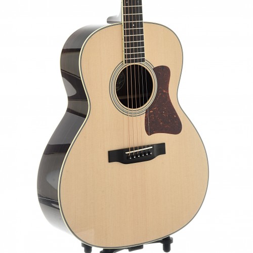 All-Mahogany Cutaway Grand Performance body shape, with black “doghair” finish and Antique White binding. Features bass side beveled top edge for arm comfort, bound fingerboard and Golden Era style CF Martin block pearl inlay in bound peghead Hardshell case