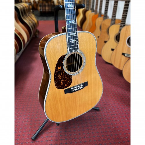 Factory left handed. All the good stuff. Fancy abalone top, back and sides purfling. Spruce top, Indian rosewood back and sides. Scalloped bracing.