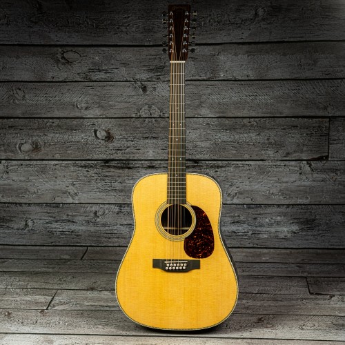The Martin HD12-28 Standard is a refined 12-string dreadnought featuring a solid spruce top with Sitka spruce bracing and East Indian rosewood back and sides. It offers enhanced playability with a beveled ebony fingerboard, improved string spacing, and a vintage-style heel. Classic Style 28 details and an aged finish complete its elegant look, combining vintage design with modern comfort for expert players.