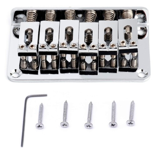 PRODUCT DESCRIPTION This is a high quality non-tremolo hardtail bridge with solid plate and saddles for Strats, Teles and other non tremolo guitars that have through body string mounting. 52.5mm(2.07in) string spread. Supplied with mounting screws and allen key to adjust the saddles. Weighing in at a nice hefty 108g this high quality black bridge should not be mistaken for a cheap pressed steel plate item and will provide a good resonance and sustain. Each of the six saddle is independently adjustable for intonation and action height so you can get your axe set up exactly as low or high as you like and ensure its in tune right across the fret board. The saddles are shaped to ensure a smooth string path whichever way your guitar is strung. Between string spacing is 10.5mm(0.41in). Base plate measurement is 76mm(2.99in), wide is 42mm(1.65in). The great thing about this bridge is that it has string holes at the back of the bridge for conventional stringing and also has them under the saddles for through body stringing. So if you have a breakage o stage you can quickly restring through the front with out having to fiddle about in the low light levels trying to string through the back. PACKAGE INCLUDE 1 x Bridge 1 x Allen key 5 x Screws NOTE Color might be slightly different due to the color calibration of each individual monitor. Please allow slightly 1-3mm measuring deviation due to manual measurement.