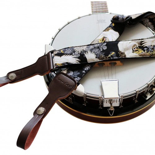 MUSIC FIRST Original Design, 2 inch width (5cm), Padded, Vintage Ukiyoe Style ”Chrysanthemum & Crane in Black ” Soft Muslin & Genuine Leather Delux Banjo Strap, With 2 pieces of MUSIC FIRST Leather Strap Locker. / Vintage Ukiyoe Style Super Cool Gold Stamping ”Chrysanthemum & Crane in Black ” Patterned Shell Fabric / Genuine Leather Strap Ends. (Since the fabric of the strap is cut from a big piece of fabric, the pattern of each strap will be a little different, That means your strap will be unique!) / Material: Cotton (out side) + Sponge Cushion Layer (Interlayer) + Cotton Meshbelt (inner side)+ABS Accessories (IMPORTANT! it will protect your Banjo not been scratched) / Width: 2 inch (5cm); Length: 62.2inch ~ 33.6inch (158cm~93cm) adjustable; Thickness: 0.15inch (0.38cm) / Two pieces of Genuine Leather MUSIC FIRST Strap Locker (Worth $7.99/piece) included. (Notice: the Banjo in the photos is not included, Thanks! )