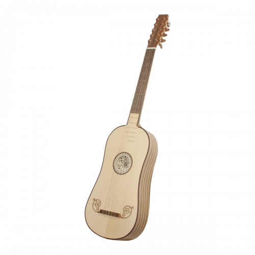 Introducing the exquisite Handcrafted String Instrument, a masterpiece of craftsmanship and sound. The body is meticulously crafted with alternating staves of lacewood and sheesham on the sides and back, finished in a sophisticated matte. The soundboard is made of spruce, complemented by a lacewood neck and a sheesham fingerboard. The instrument features tied nylon frets on the neck and six sheesham frets on the spruce soundboard. The tuning pegs are also crafted from sheesham, ensuring precision and durability. With five courses of two strings each, this instrument offers a rich and resonant sound, enhanced by the ornate lacewood mustache bridge and the intricate parchment-style rosette surrounding the soundhole.