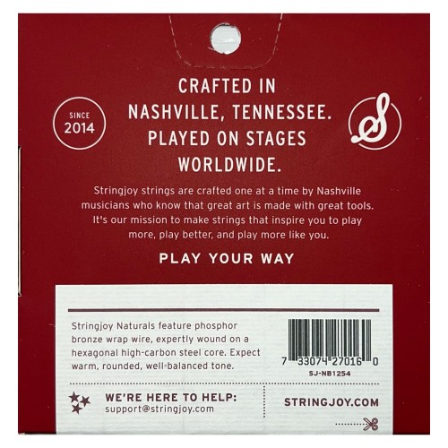 Warm, full-bodied rich tone with a natural feel. The Stringjoy Naturals are made with a special phosphor bronze alloy that works well for both fingerpicking and strumming. Made in Nashville, TN out of high quality materials with exacting attention to detail.