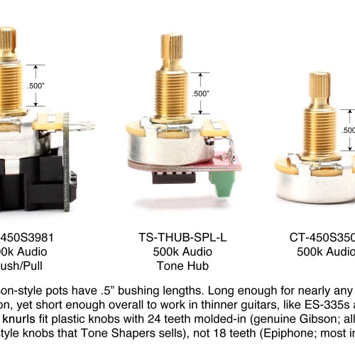 Set of four CTS pots, compatible with most LP, 335, and SG-style guitars. 500k audio, 24-tooth knurl. Pots have .5” bushing lengths, for rear-routed applications. Long enough to get through a guitar top, but still short enough overall to fit in an ES-335 or SG.We order these pots in CTS low-torque configuration, with the dimpled back that Fender pots have. This makes them easier to turn than typical CTS pots with flat backs, as used by many other sellers.PLEASE NOTE: These pots do not have 3/4” length bushings. Those started appearing Les Pauls in the late 1970s. If you have a Les Paul that has the pots mounted on a metal plate, and if you want to keep the plate in there (for most Les Paul owners it serves no useful purpose), then our pots are not long enough.Requires knobs with 24 teeth.