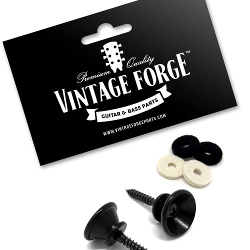 Features: High quality Vintage Forge Black metal strap button set comes complete with 2 buttons, 2 matching screws, and 4 felt washers (both black and white). These are over sized vintage style large strap buttons and will fit virtually any Acoustic or Electric Guitar, Bass, Mandolin and Ukulele. Easy to install.Specifications: Material: MetalFinish: BlackButton Diameter: 17mm Height: 9.3mmScrew Length: 25mm Weight: 16g (0.6oz)